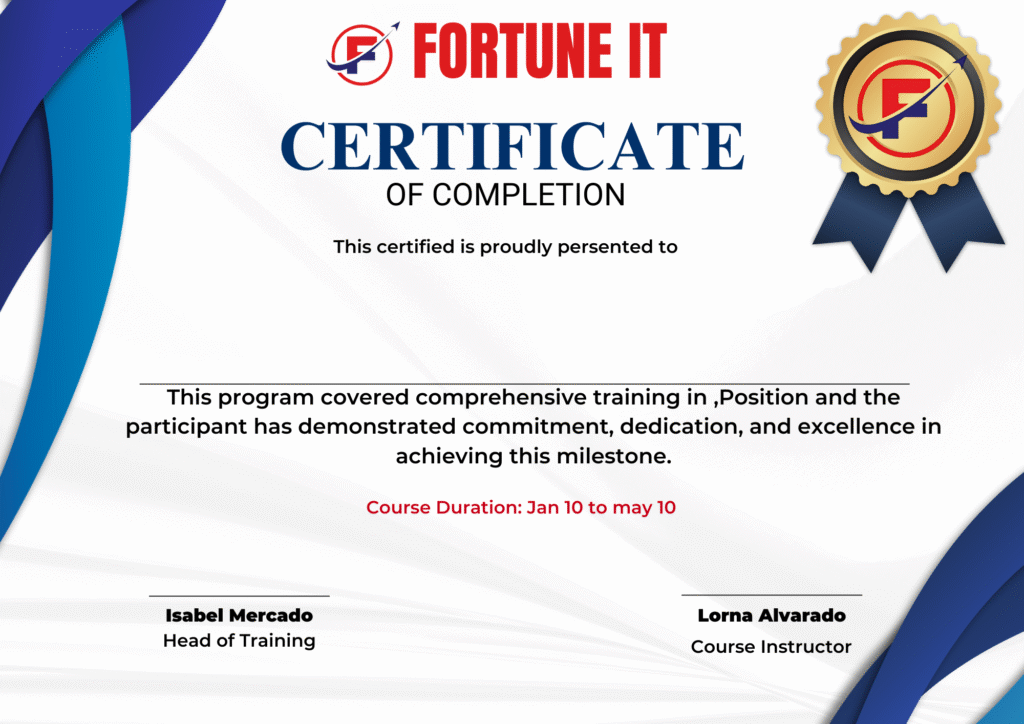 At Fortune IT, we believe in recognizing the hard work and dedication of our learners. Every student who successfully completes our training programs receives a Certificate of Completion, showcasing their expertise and commitment to professional growth.